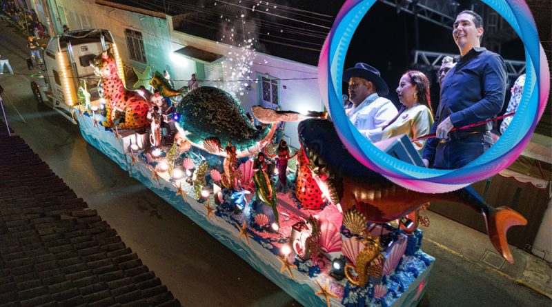 Detrás de la comparsa desfiló un imponente carro alegórico decorado con figuras representativas de la flora y la fauna del municipio, en el cual viajaba la reina de Bahía de Banderas, Keyla Arreola, quien saludó con entusiasmo a las familias de Santa María del Oro.