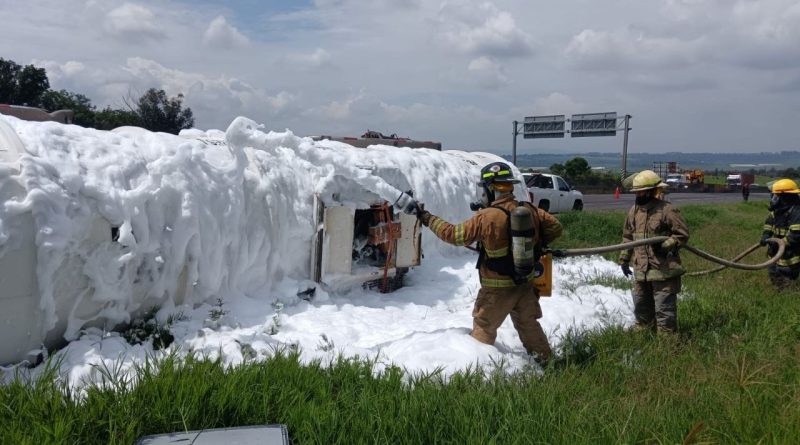 Tepatitlán, Jal.- Se registró un aparatoso accidente en el kilómetro 39 de la autopista a Los Altos, en el municipio de Tepatitlán, cuando una pipa de combustible volcó tras ser impactada por un vehículo de carga pesada.