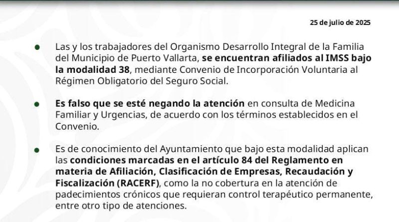 A través de un video difundido en canales oficiales, el IMSS aclaró que los trabajadores del municipio se encuentran afiliados bajo la modalidad 38, mediante un Convenio de Incorporación Voluntaria al Régimen Obligatorio del Seguro Social.