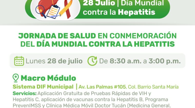 Con motivo del Día Mundial contra la Hepatitis, que se conmemora el próximo 28 de julio, la Dirección de Promoción de la Salud, a través de su Coordinación Municipal de VIH y Enfermedades de Transmisión Sexual (COMUSIDA), instalará cuatro módulos de atención simultánea en distintos puntos estratégicos del municipio.