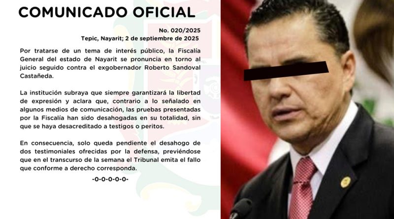 Tepic, Nay., 2 de septiembre de 2025. — La Fiscalía General del Estado de Nayarit emitió un comunicado oficial en el que precisó detalles sobre el juicio que se sigue contra el exgobernador Roberto Sandoval Castañeda, considerado un tema de interés público.
