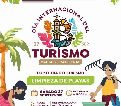 Este próximo sábado 27 de septiembre, el H. XII Ayuntamiento de Bahía de Banderas, encabezado por el presidente municipal Héctor Santana, llevará a cabo una Limpieza de Playas en la desembocadura del río Ameca (Ingreso por Playa Villa Varadero), en un horario de 7:00 a 11:00 de la mañana, en el marco del Día Internacional del Turismo.