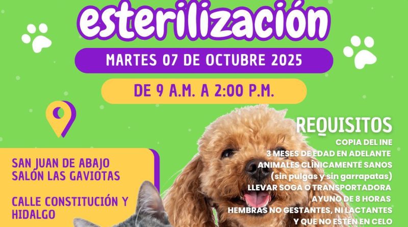 El Gobierno de Bahía de Banderas, que encabeza el presidente municipal Héctor Santana, a través de la Dirección de Medio Ambiente, invita a todos los dueños de mascotas a participar en la jornada gratuita de esterilización que se realizará este próximo martes 7 de octubre de 2025, de 9:00 de la mañana a 2:00 de la tarde, en el Salón Las Gaviotas, ubicado en calle Constitución y calle Hidalgo, en San Juan de Abajo.