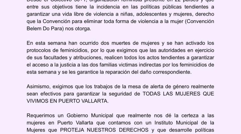 El colectivo feminista y de mujeres líderes 50+1 lanzó un enérgico llamado a las autoridades de Puerto Vallarta para que se esclarezcan y se investiguen con perspectiva de género los dos presuntos feminicidios registrados en la ciudad durante los últimos días.