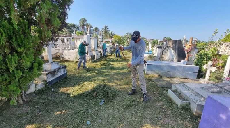 Personal del área realiza trabajos de limpieza, poda, alumbrado y mantenimiento en los cinco cementerios municipales, como parte de los preparativos para recibir a miles de visitantes durante las celebraciones del Día de Muertos.