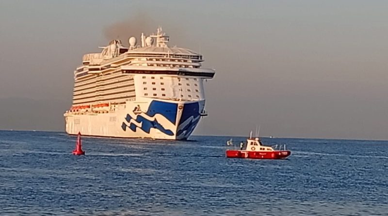 Minutos más tarde, a las 7:30 horas, llegó el Royal Princess, proveniente de Mazatlán y con rumbo a Los Ángeles. Este crucero, de 330 metros de eslora, arribó con 3,622 pasajeros y 1,322 tripulantes a bordo.