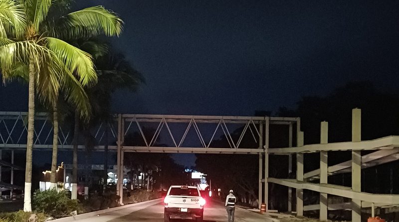 A pesar del ajuste en los tiempos de ejecución, la obra del puente peatonal en el Nodo Vial de Las Juntas registra avances significativos y visibles, con la instalación completa de las estructuras principales que cruzan los carriles de la carretera federal 200.